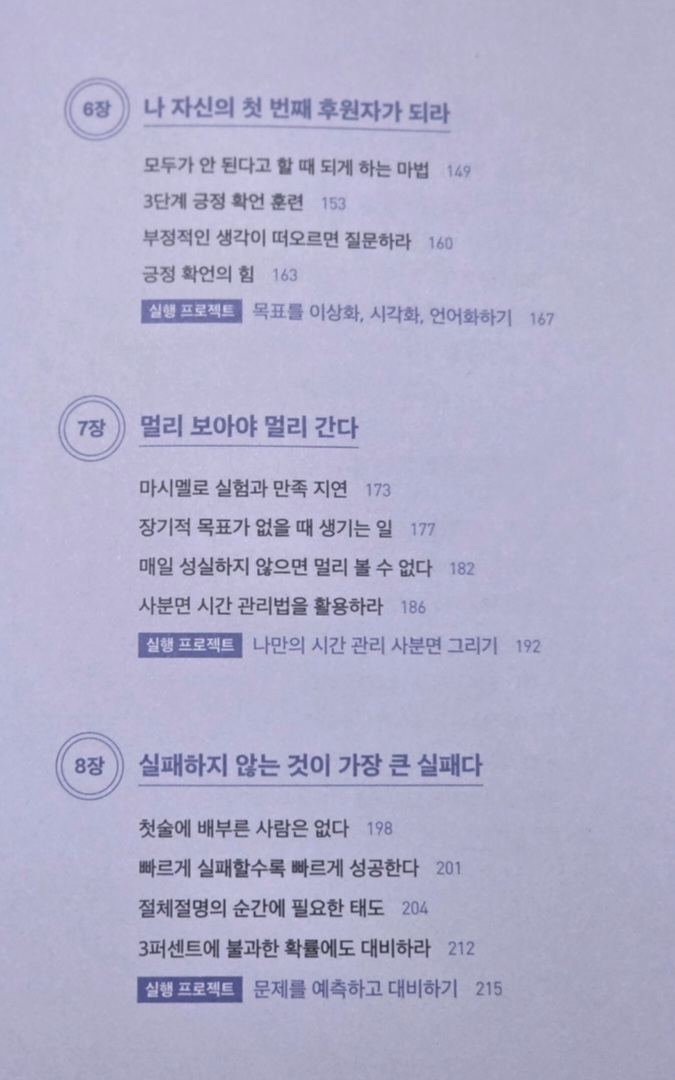 챕터마다 관련 명언, 마무리 부분에는 핵심정리 및 실행프로젝트가 작성되어 있어