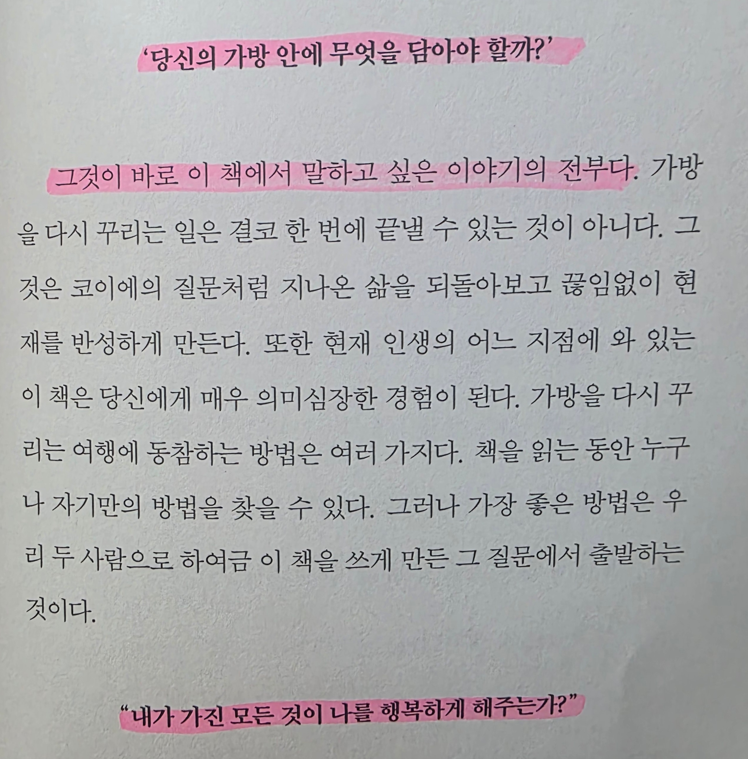 "이 모든 것이 당신을 행복하게 해줍니까?" 저자의 마음을 파고드는 한마디에 가지고 온 짐들을 다시 정리하게 된다.